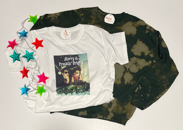 “Close-up of ‘Merry Freakin’ Bright’ print on graphic tee”